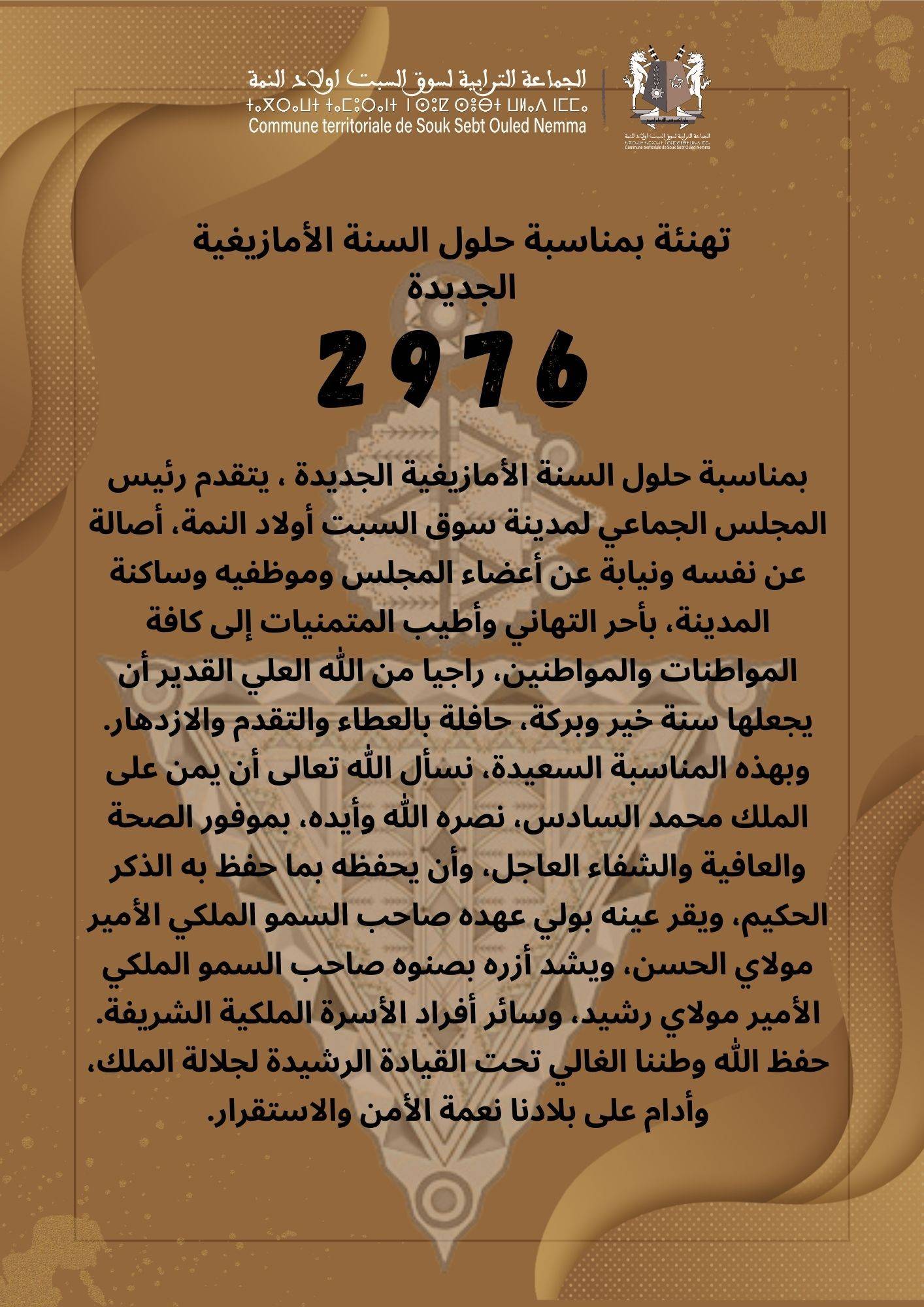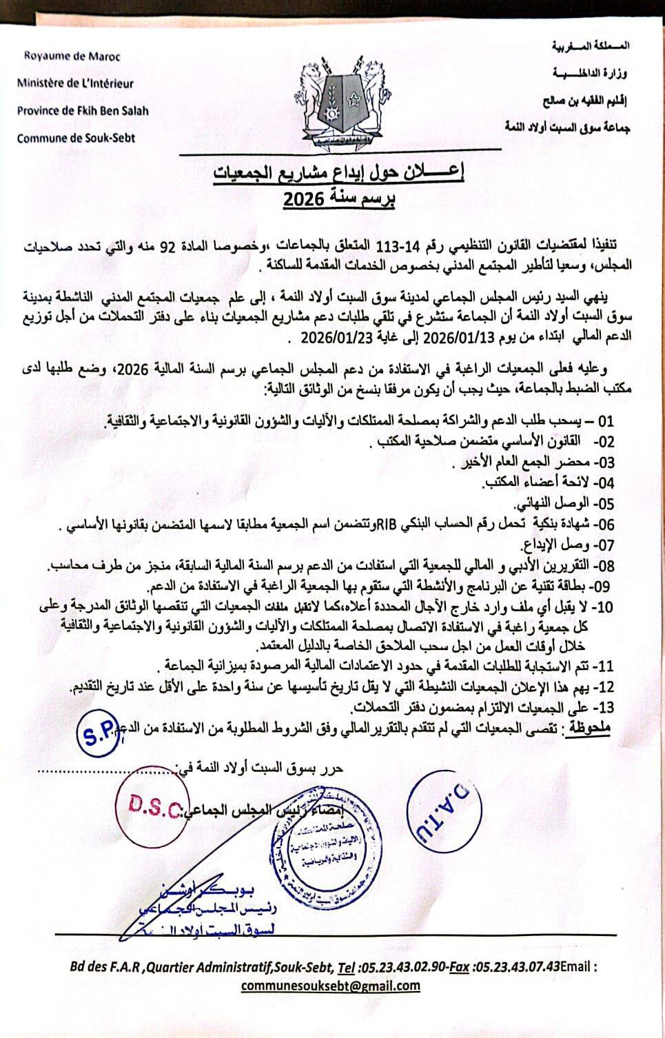 في إطار مساهمة جماعة سوق السبت أولاد النمة في إنجاح عملية تسجيل المواطنات والمواطنين في السجل الوطني للسكان، ينهي السيد رئيس المجلس الجماعي لمدينة سوق السبت اولاد النمة إلى علم ساكنة المدينة أن ملء استمارة التسجيل الخاصة بهذه العملية ستكون بمقر الجماعة و بالملحقات الإدراية الثلاث التابعة لها بالمجان من طرف موظفي الجماعة.