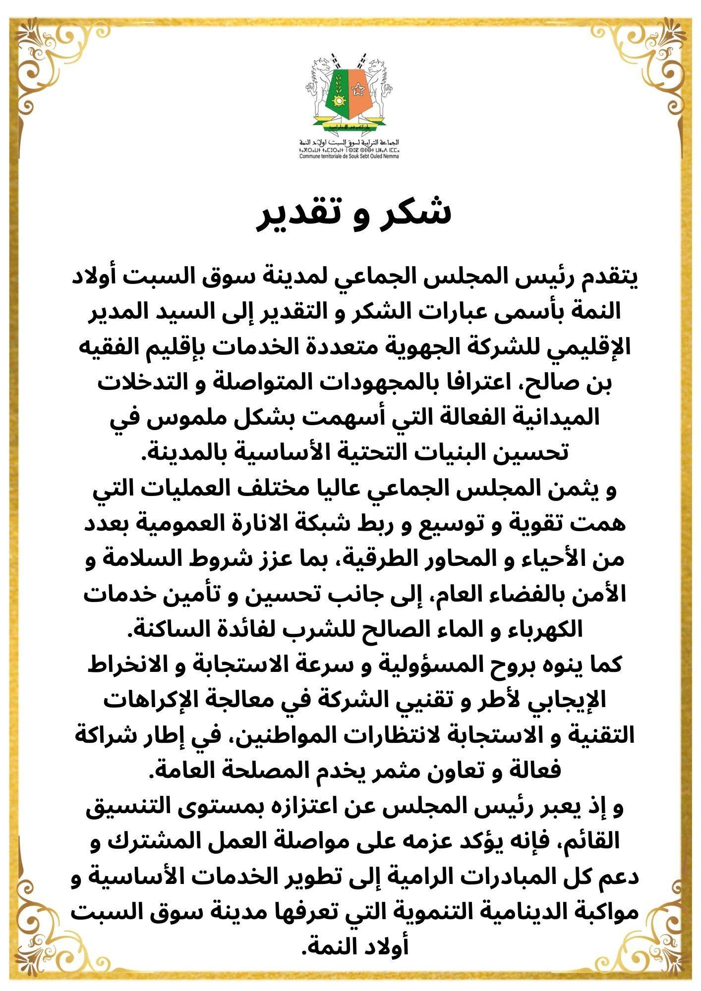 وبهذه المناسبة، يتقدم رئيس المجلس الجماعي لسوق السبت أولاد النمة بجزيل الشكر والامتنان لوالي جهة بني ملال خنيفرة، ولرئيس مجلس الجهة وأعضائه، ولعامل إقليم الفقيه بن صالح، ولكل من ساهم في توفير هذه الآلية الصحية المهمة، تقديرا لجهودهم ودعمهم المتواصل لخدمة الصالح العام.